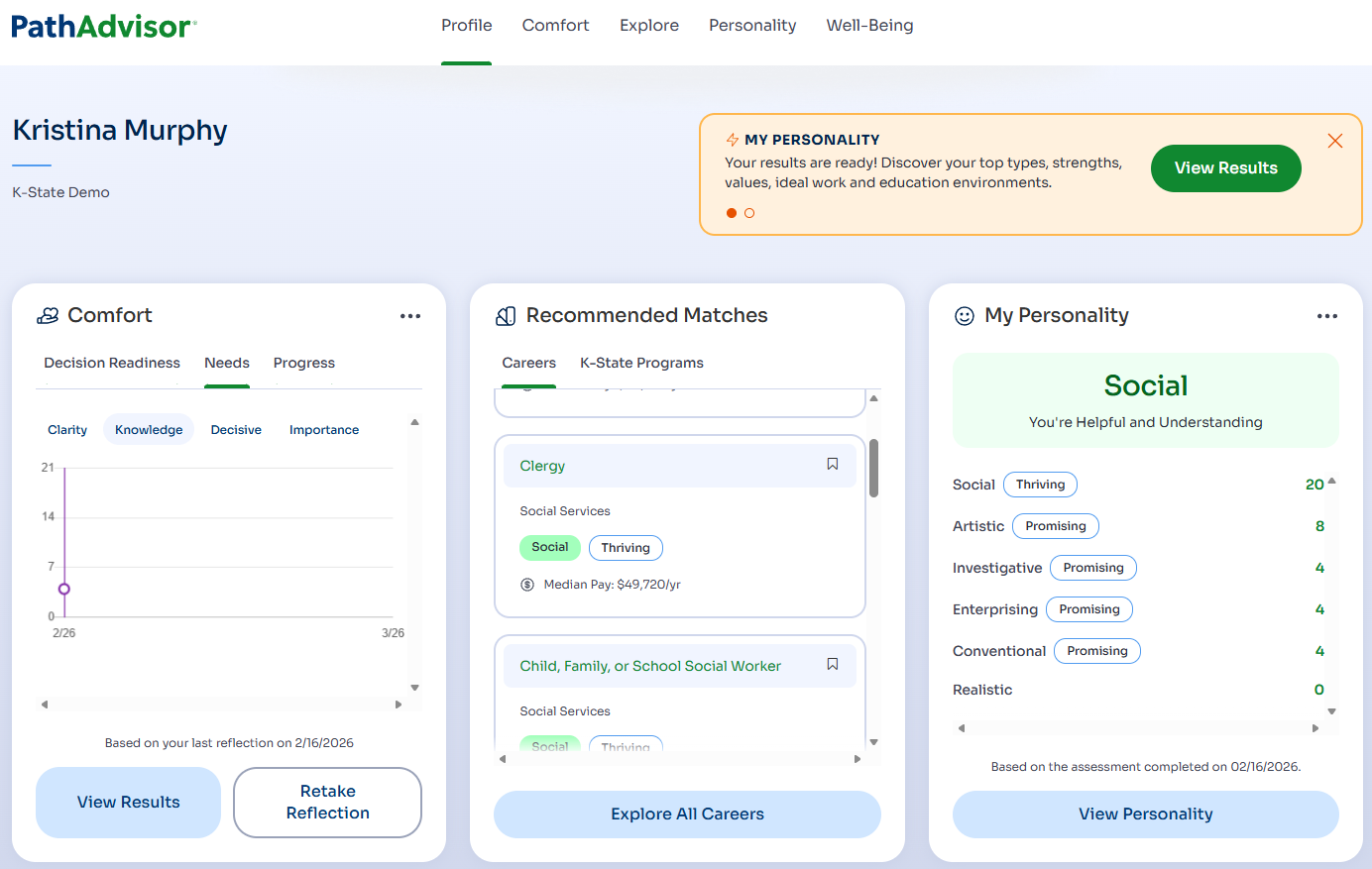 PathAdvisor helps you teach career competencies, match students to best-fit majors and careers, and actionable data — without adding to your workload. Backed by 30+ years of peer-reviewed research.