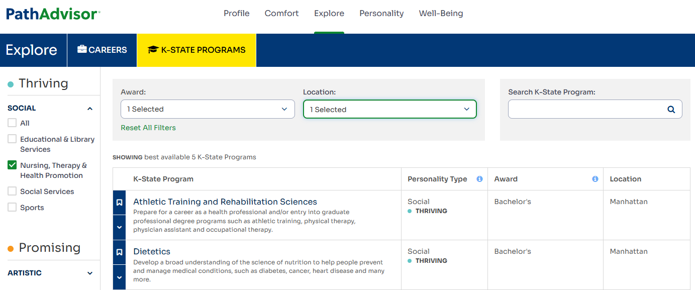 Every student explores only the majors, programs, and careers at your institution in intuitive groups. Through a short, validated assessment based on the respected Holland's Theory, students discover what's thriving, promising, and challenging for them with links to your program pages.